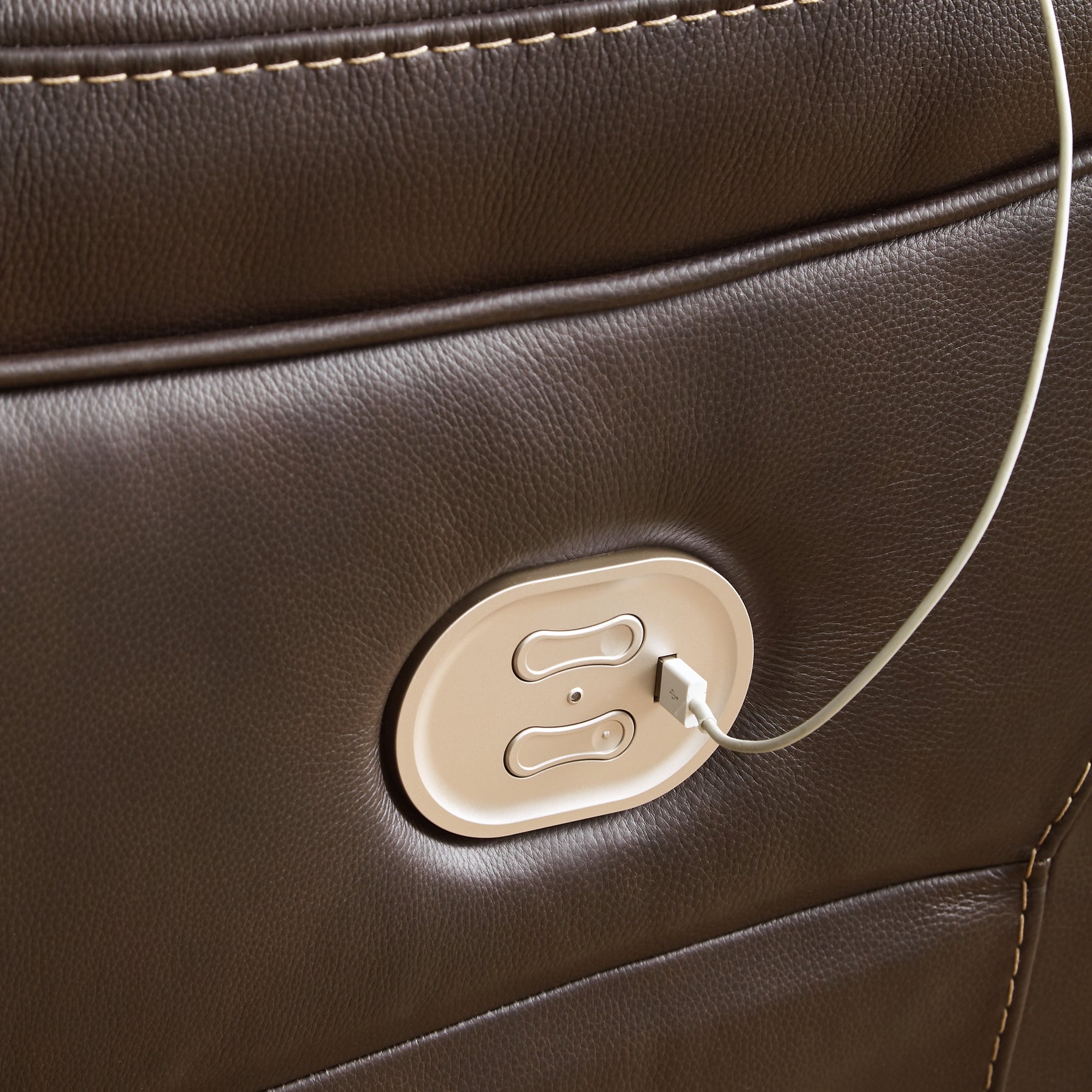Load up on comfort in a cool, clean-lined and contemporary way with this power reclining sofa in chocolate brown. Rest assured, the expertly matched leather and faux leather upholstery is enriched with a pebble grain effect for authentic appeal and enhanced with jumbo stitching for dramatic contrast. It features a one-touch power control with adjustable positions, along with an Easy View™ adjustable headrest that allows a primo view of the TV even when you're reclined. Extended ottomans provide extra length for leg comfort. A zero-draw USB plug-in at your fingertips lets you charge up as you chill out.