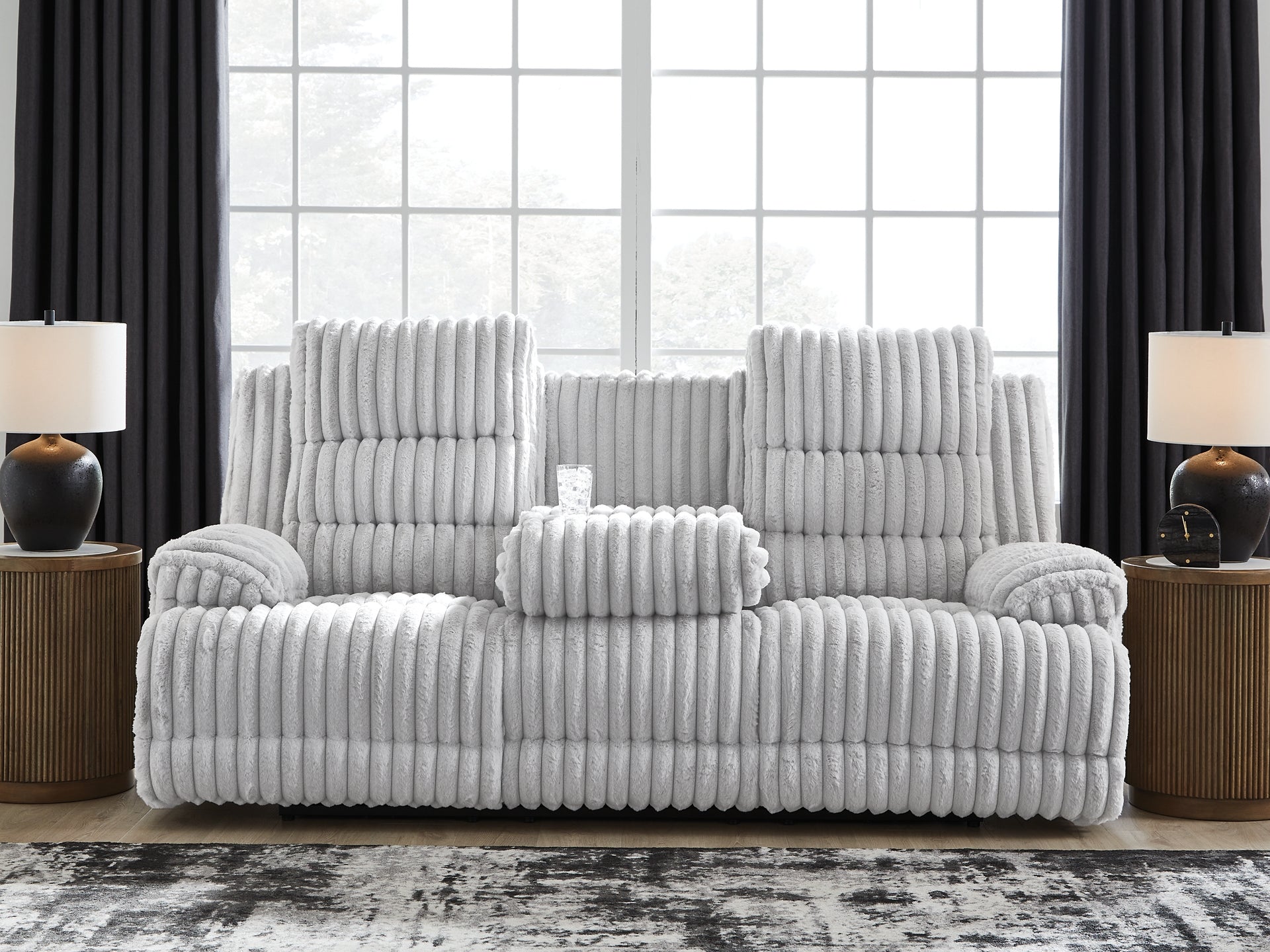 We don’t know about you, but one look at this power reclining sofa makes us want to settle in and never leave. There’s so much to love—we'll start with its cozy corduroy and stylish contemporary design. Let’s not forget its one-touch reclining and pillowy cushions, offering easy and instant relaxation that feels right at home. Plus the middle seat’s drop-down table is indulgently convenient.